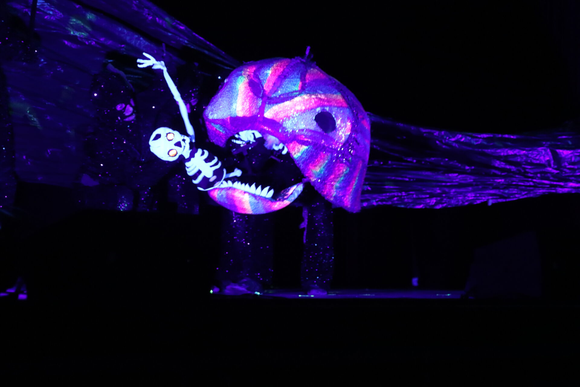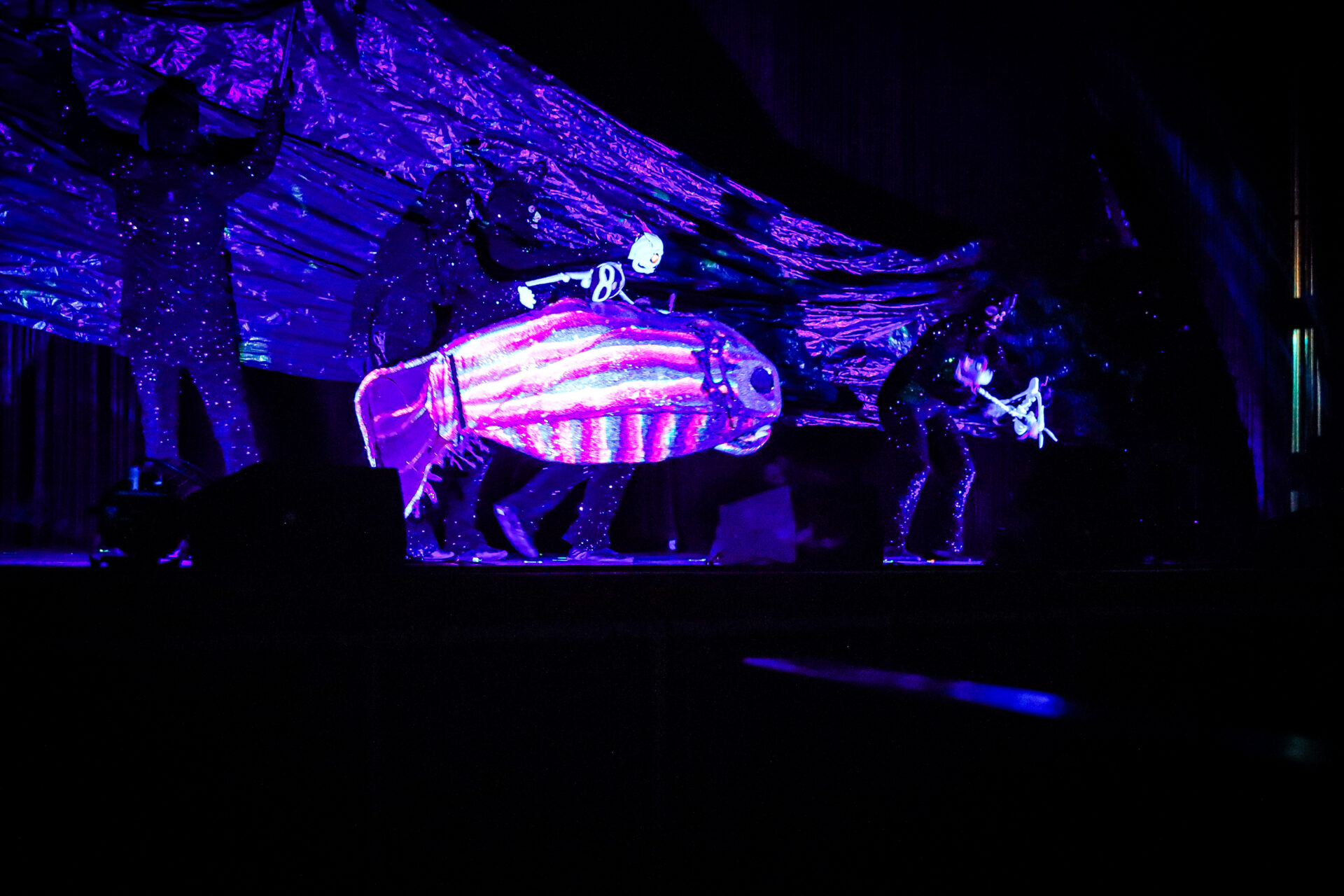 This extraordinary show combines large-scale puppetry, cinematic shadow play, original music, and live action, resulting in a unique aesthetic that enchanted children, youth, and adults alike. Its bold narrative follows two skeletal friends—a dodo and a boy—who struggle to survive in the underworld by collecting bones to keep their deteriorating bodies intact. However, when the dodo miraculously comes back to life as real feathers begin to emerge, a revolution is set into motion—one that disrupts the order of the dead and thrusts the pair into an epic escape for survival.